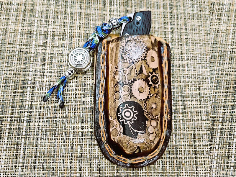 Features: Custom graphic (deep etched) on the blade's side, sheath images (compression) with beads and paracord. A true one of a kind for the mechanically inclined.
