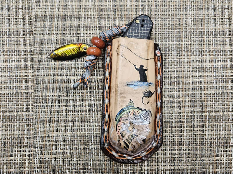 Features: A very sharp tanto style blade. Many graphics: (deep etched) fly fishing lure on the Damascu blade,